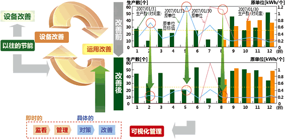 以往的設備節能是以「引進節能設備?機器?新技術」即設備改善為主體,是針對點的改善。三菱電機認為「依據可視化管理具體把握能量消耗的動向,做到庫華制冷適合化」這種通過可視化管理將設備改善與運用改善綜合鏈接的活動才是持續節能的重點所在。如圖所示: